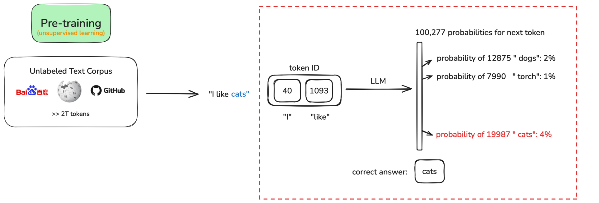 - 在看到 “What do you like?” + 回复 “I like” 的情况下,继续预测出 “cats”。