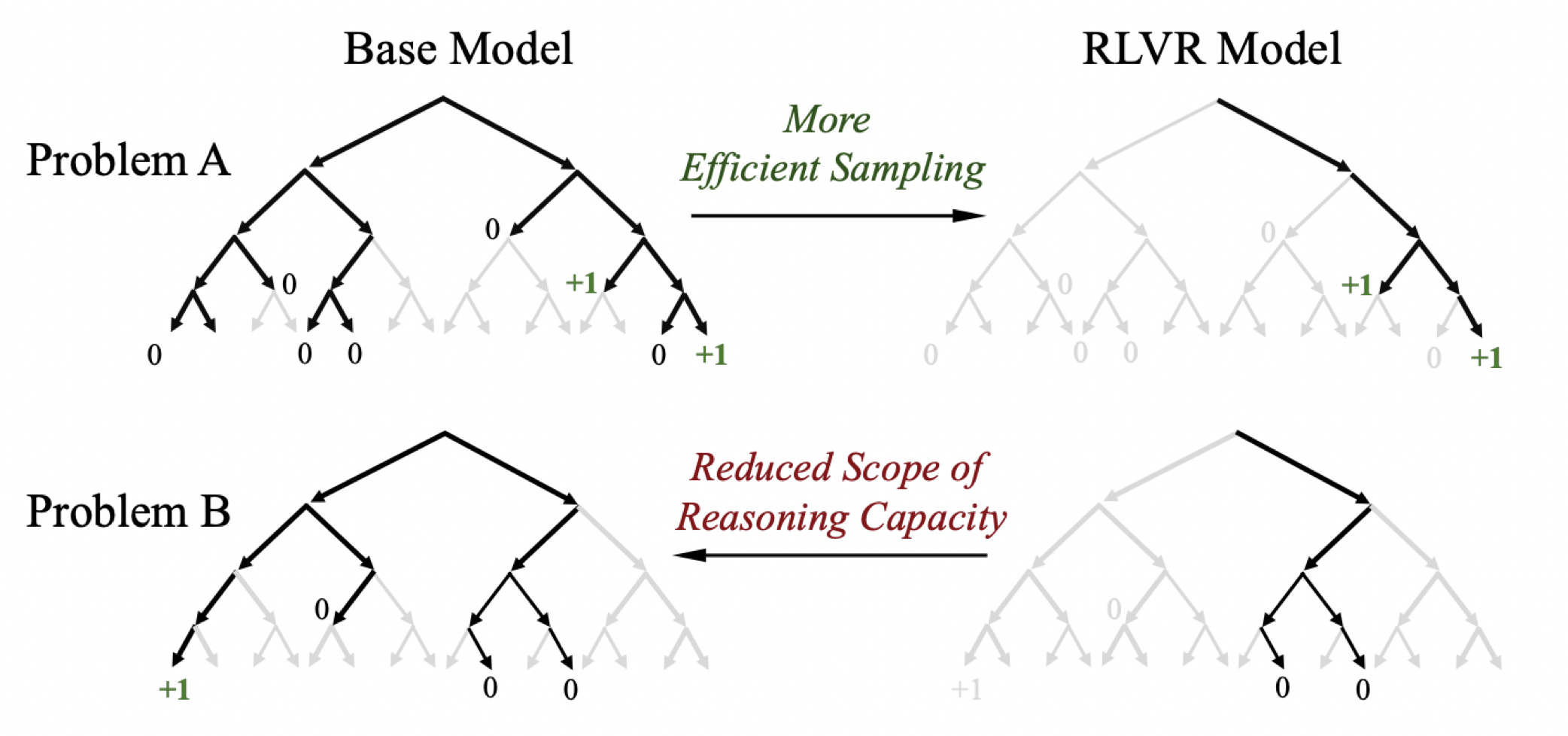 - RL 训练引导模型倾向于生成高奖励的路径,从而提高采样效率,使模型能够更快地找到期望答案。然而,这种偏向性同时也削弱了模型的探索能力。