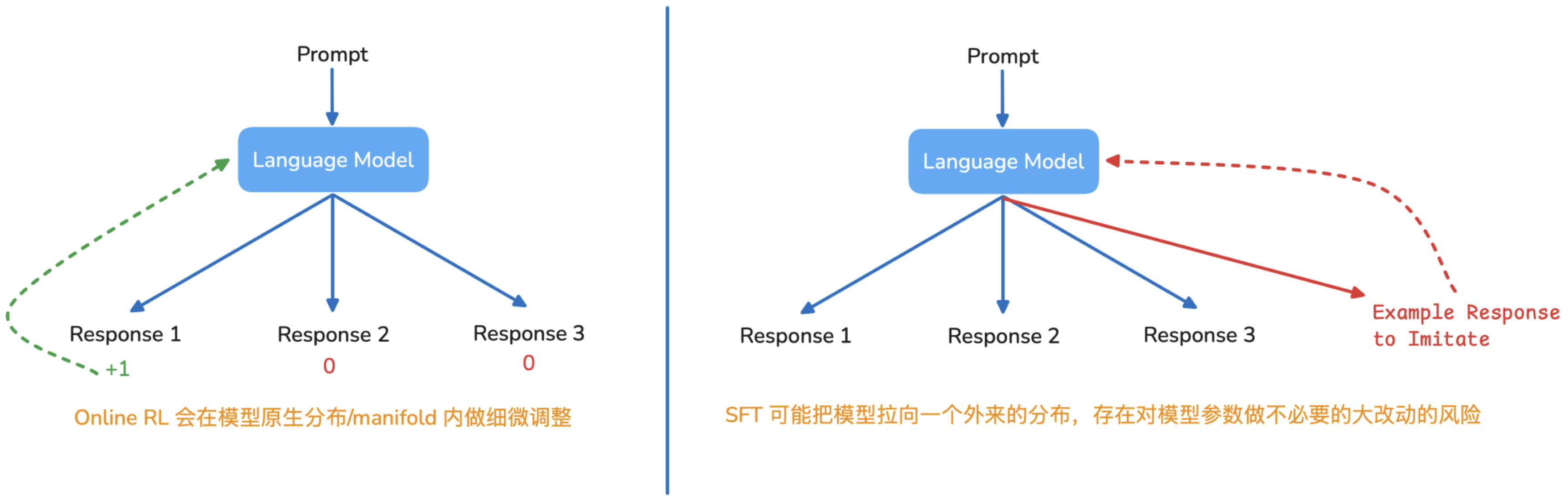 - RL 会从模型自身生成的每个 responses 中获得 reward,并根据 reward 更新模型参数。本质上,更像是在模型原生分布里做局部调整。